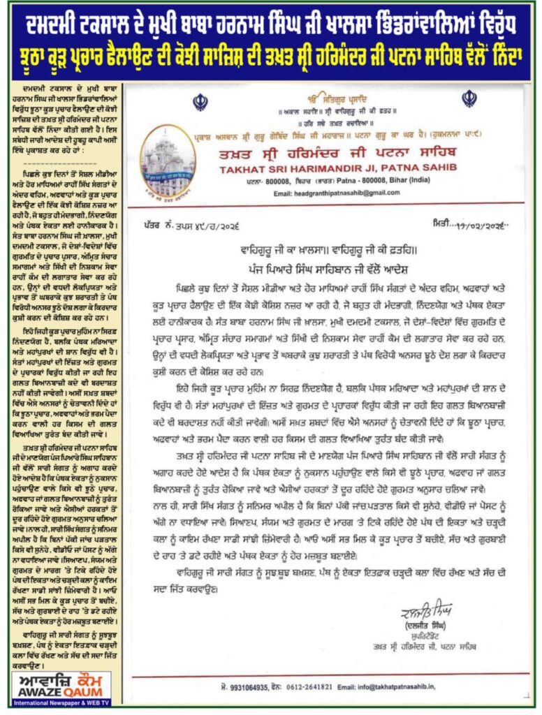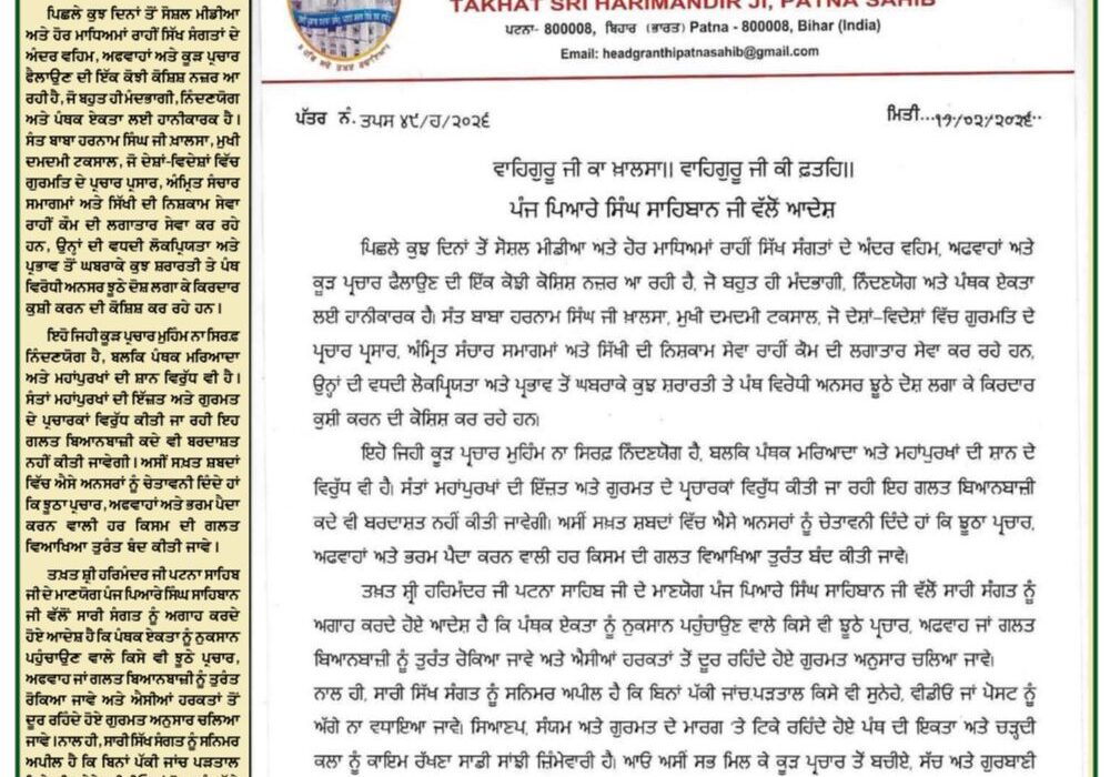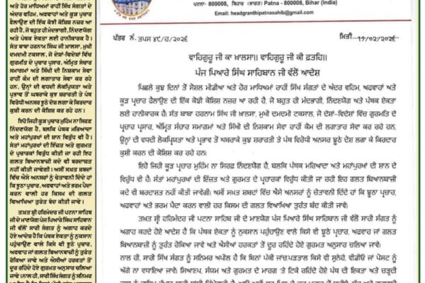 ਤਖ਼ਤ ਸ੍ਰੀ ਹਰਿਮੰਦਰ ਜੀ ਪਟਨਾ ਸਾਹਿਬ ਦੇ ਪੰਜ ਪਿਆਰੇ ਸਿੰਘ ਸਾਹਿਬਾਨ ਵੱਲੋਂ ਆਦੇਸ਼ 18 ਫਰਵਰੀ 2026, ਪਟਨਾ ਸਾਹਿਬ – ਤਖ਼ਤ ਸ੍ਰੀ ਹਰਿਮੰਦਰ ਜੀ ਪਟਨਾ ਸਾਹਿਬ ਦੇ ਪੰਜ ਪਿਆਰੇ ਸਿੰਘ ਸਾਹਿਬਾਨ ਵੱਲੋਂ ਸੰਤ ਬਾਬਾ ਹਰਨਾਮ ਸਿੰਘ ਜੀ ਖਾਲਸਾ ਭਿੰਡਰਾਂਵਾਲੇ ਮੁਖੀ ਦਮਦਮੀ ਟਕਸਾਲ ਵਿਰੁੱਧ ਸੋਸ਼ਲ ਮੀਡੀਆ ਅਤੇ ਹੋਰ ਮਾਧਿਅਮਾਂ ਰਾਹੀਂ ਫੈਲਾਏ ਜਾ ਰਹੇ ਝੂਠੇ ਪ੍ਰਚਾਰ,...