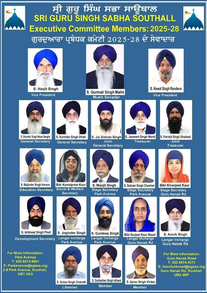 ਸ੍ਰੀ ਗੁਰੂ ਸਿੰਘ ਸਭਾ ਸਾਊਥਾਲ ਦੀ ਨਵੀਂ ਪ੍ਰਬੰਧਕ ਕਮੇਟੀ 2025–28 ਦਾ ਐਲਾਨ