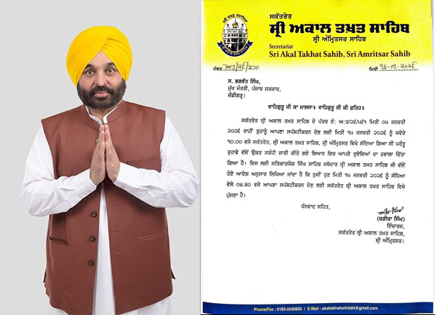 ਮੁੱਖ ਮੰਤਰੀ ਭਗਵੰਤ ਮਾਨ ਨੇ ਸ੍ਰੀ ਅਕਾਲ ਤਖ਼ਤ ਸਾਹਿਬ ਨੂੰ ਸਪੱਸ਼ਟ ਕੀਤਾ: 15 ਜਨਵਰੀ ਨੂੰ ਸਵੇਰੇ 10 ਵਜੇ ਹਾਜ਼ਰ ਹੋਵਾਂਗਾ
