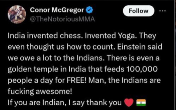 ਅੰਮ੍ਰਿਤਸਰ, 10 ਅਕਤੂਬਰ 2025: ਮਸ਼ਹੂਰ MMA ਫਾਈਟਰ ਕੋਨਰ ਮੈਕਗ੍ਰੇਗਰ ਨੇ ਟਵਿੱਟਰ ‘ਤੇ ਇੱਕ ਟਵੀਟ ਕਰਕੇ ਭਾਰਤ ਦੇ ਯੋਗਦਾਨ ਅਤੇ ਸੱਚਖੰਡ ਸ੍ਰੀ ਦਰਬਾਰ ਸਾਹਿਬ ਦੀ ਸੇਵਾ ਦੀ ਭਰਪੂਰ ਸ਼ਲਾਘਾ ਕੀਤੀ ਹੈ। ਉਹਨਾਂ ਨੇ ਲਿਖਿਆ, “ਭਾਰਤ ਨੇ ਚੈਸ, ਯੋਗਾ ਅਤੇ ਗਿਣਤੀ ਦੀ ਕਲਾ। ਭਾਰਤ ਵਿੱਚ ਇੱਕ Golden Temple (ਸ੍ਰੀ ਹਰਿਮੰਦਰ ਸਾਹਿਬ) ਹੈ ਜੋ ਰੋਜ਼ 100,000 ਲੋਕਾਂ ਨੂੰ ਮੁਫ਼ਤ ਭੋਜਨ ਦਿੰਦਾ ਹੈ! ਭਾਰਤੀ ਸੱਚਮੁੱਚ ਸ਼ਾਨਦਾਰ ਹਨ। ਜੇ ਤੁਸੀਂ ਭਾਰਤੀ ਹੋ, ਤਾਂ ਮੈਂ ਤੁਹਾਡਾ ਧੰਨਵਾਦ ਕਰਦਾ ਹਾਂ।”