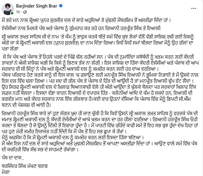 “ਸ਼੍ਰੋਮਣੀ ਅਕਾਲੀ ਦਲ (ਪੁਨਰ ਸੁਰਜੀਤ) ਤੋਂ ਬਰਜਿੰਦਰ ਸਿੰਘ ਮੱਖਣ ਬਰਾੜ ਦਾ ਅਸਤੀਫਾ