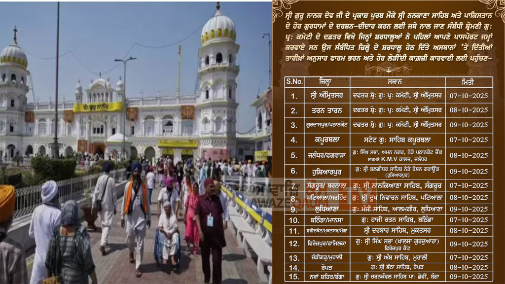 ਅੰਮ੍ਰਿਤਸਰ, 3 ਅਕਤੂਬਰ 2025 ਸ੍ਰੀ ਗੁਰੂ ਨਾਨਕ ਦੇਵ ਜੀ ਦੇ ਪ੍ਰਕਾਸ਼ ਪੁਰਬ ਮੌਕੇ ਸ਼੍ਰੋਮਣੀ ਗੁਰਦੁਆਰਾ ਪ੍ਰਬੰਧਕ ਕਮੇਟੀ (ਐਸਜੀਪੀਸੀ) ਨੇ ਸ਼ਰਧਾਲੂਆਂ ਲਈ ਸ੍ਰੀ ਨਨਕਾਣਾ ਸਾਹਿਬ ਅਤੇ ਪਾਕਿਸਤਾਨ ਦੇ ਹੋਰ ਗੁਰਧਾਮਾਂ ਦੇ ਦਰਸ਼ਨ-ਦੀਦਾਰ ਲਈ ਜਥੇ ਨਾਲ ਜਾਣ ਸੰਬੰਧੀ ਰਜਿਸਟ੍ਰੇਸ਼ਨ ਪ੍ਰਕਿਰਿਆ ਸ਼ੁਰੂ ਕੀਤੀ ਹੈ। ਉਹ ਸ਼ਰਧਾਲੂ ਜੋ ਪਹਿਲਾਂ ਆਪਣੇ ਪਾਸਪੋਰਟ ਜਮ੍ਹਾਂ ਕਰਵਾ ਚੁੱਕੇ ਹਨ, ਉਹਨਾਂ ਲਈ ਜ਼ਿਲ੍ਹਾ-ਵਾਰ ਸ਼ੈਡਿਊਲ ਜਾਰੀ ਕੀਤਾ ਗਿਆ ਹੈ।
