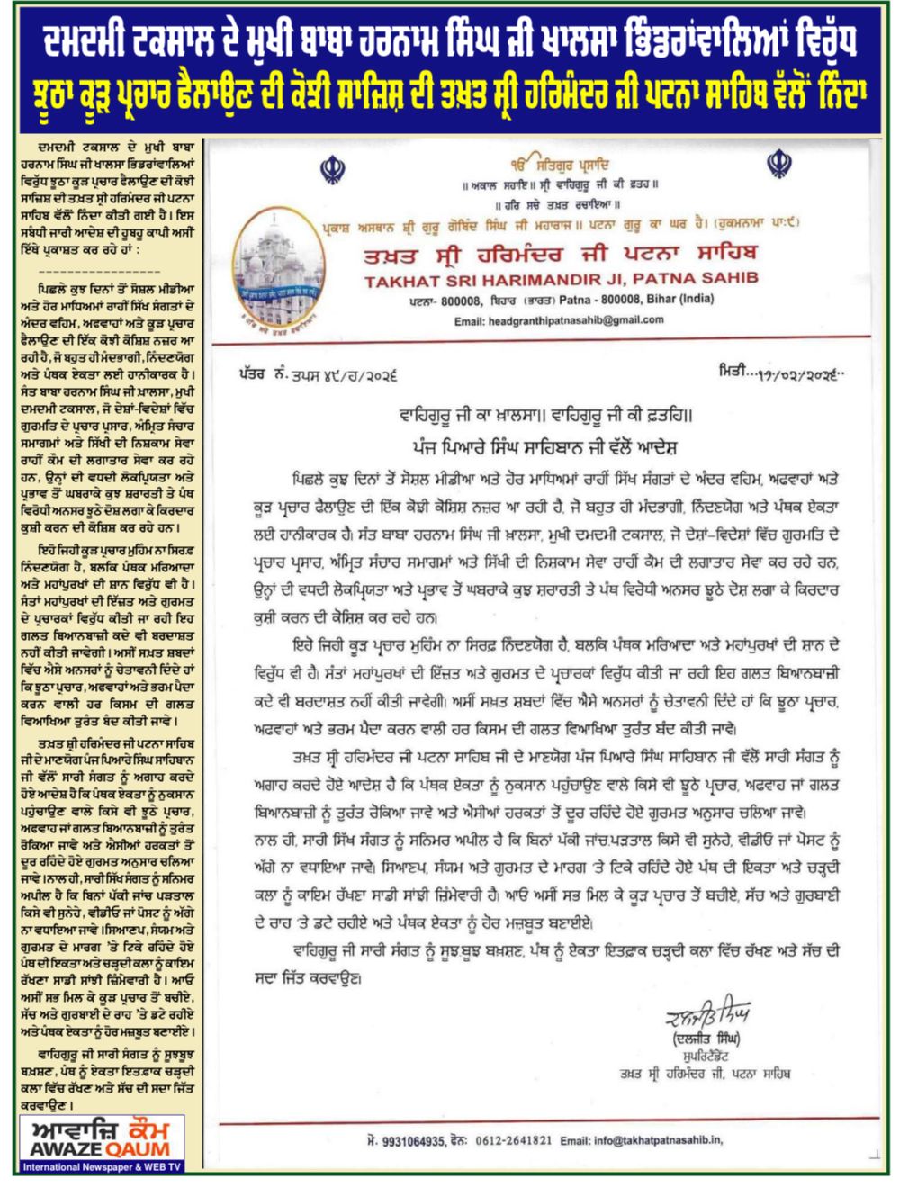 18 ਫਰਵਰੀ 2026, ਪਟਨਾ ਸਾਹਿਬ – ਤਖ਼ਤ ਸ੍ਰੀ ਹਰਿਮੰਦਰ ਜੀ ਪਟਨਾ ਸਾਹਿਬ ਦੇ ਪੰਜ ਪਿਆਰੇ ਸਿੰਘ ਸਾਹਿਬਾਨ ਵੱਲੋਂ ਸੰਤ ਬਾਬਾ ਹਰਨਾਮ ਸਿੰਘ ਜੀ ਖਾਲਸਾ ਭਿੰਡਰਾਂਵਾਲੇ ਮੁਖੀ ਦਮਦਮੀ ਟਕਸਾਲ ਵਿਰੁੱਧ ਸੋਸ਼ਲ ਮੀਡੀਆ ਅਤੇ ਹੋਰ ਮਾਧਿਅਮਾਂ ਰਾਹੀਂ ਫੈਲਾਏ ਜਾ ਰਹੇ ਝੂਠੇ ਪ੍ਰਚਾਰ, ਅਫਵਾਹਾਂ ਅਤੇ ਕੂੜ ਬਿਆਨਬਾਜ਼ੀ ਨੂੰ ਰੋਕਣ ਲਈ ਸਖ਼ਤ ਆਦੇਸ਼ ਜਾਰੀ ਕੀਤਾ ਗਿਆ ਹੈ। ਸੁਪਰਡੈਂਟ ਸ. ਦਲਜੀਤ ਸਿੰਘ ਵੱਲੋਂ ਜਾਰੀ ਇਸ ਆਦੇਸ਼ ਵਿੱਚ ਕਿਹਾ ਗਿਆ ਹੈ ਕਿ ਪਿਛਲੇ ਕੁਝ ਦਿਨਾਂ ਤੋਂ ਸੰਤ ਬਾਬਾ ਹਰਨਾਮ ਸਿੰਘ ਜੀ ਦੀ ਵਧਦੀ ਲੋਕਪ੍ਰਿਯਤਾ ਅਤੇ ਗੁਰਮਤਿ ਪ੍ਰਚਾਰ ਤੋਂ ਈਰਖਾ ਕਰਕੇ ਕੁਝ ਸ਼ਰਾਰਤੀ ਅਤੇ ਪੰਥ ਵਿਰੋਧੀ ਅਨਸਰ ਝੂਠੇ ਦੋਸ਼ ਲਗਾ ਕੇ ਕਿਰਦਾਰ ਘਾਟ ਕਰਨ ਦੀ ਕੋਸ਼ਿਸ਼ ਕਰ ਰਹੇ ਹਨ।