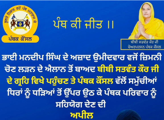 ਪੰਥਕ ਏਕਤਾ ਦਾ ਸੁਨੇਹਾ – ਬੀਬੀ ਸਤਵੰਤ ਕੌਰ ਨੇ ਭਾਈ ਮਨਦੀਪ ਸਿੰਘ ਨੂੰ ਦਿੱਤਾ ਆਸ਼ੀਰਵਾਦ, ਸਭ ਧਿਰਾਂ ਨੂੰ ਸਾਂਝੇ ਪੰਥਕ ਉਮੀਦਵਾਰ ਦੇ ਸਹਿਯੋਗ ਦੀ ਅਪੀਲ